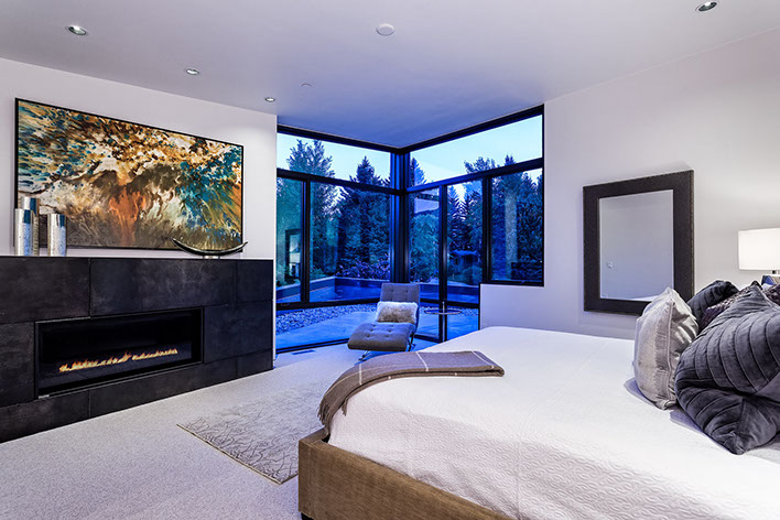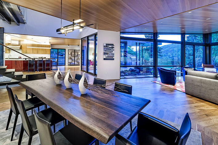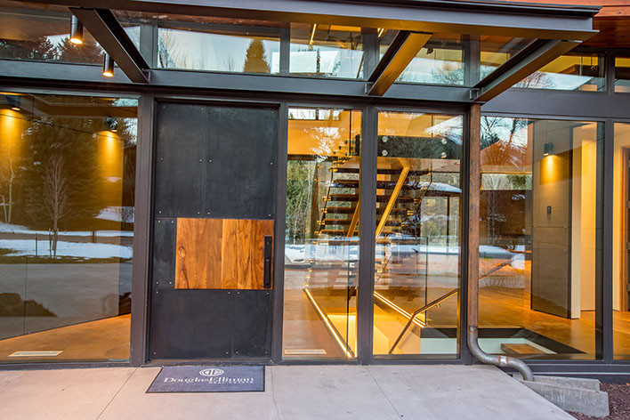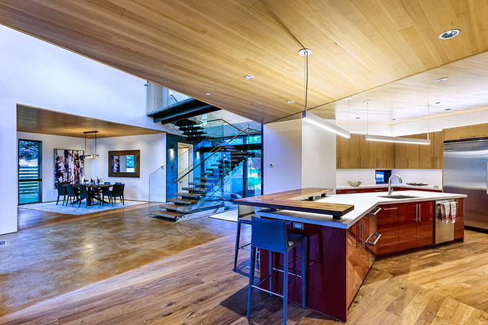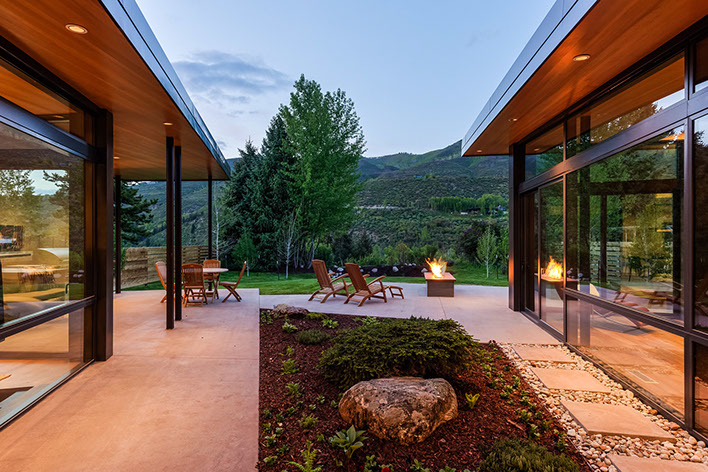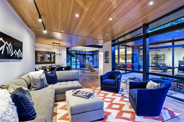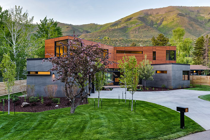 The unusual roof lines of the house are designed to maximize views by raising the roof / ceiling lines toward Aspen Mountain, Aspen Highlands, and Red Mountain.