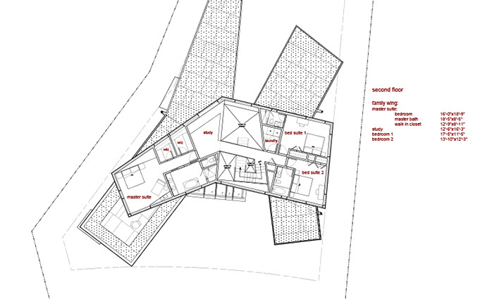The east wing is programmatically dedicated to guest functions; great room, dining area, and guest bedroom suite. The east wing contains the family living functions; garage, mud room, pantry, kitchen and family living room.