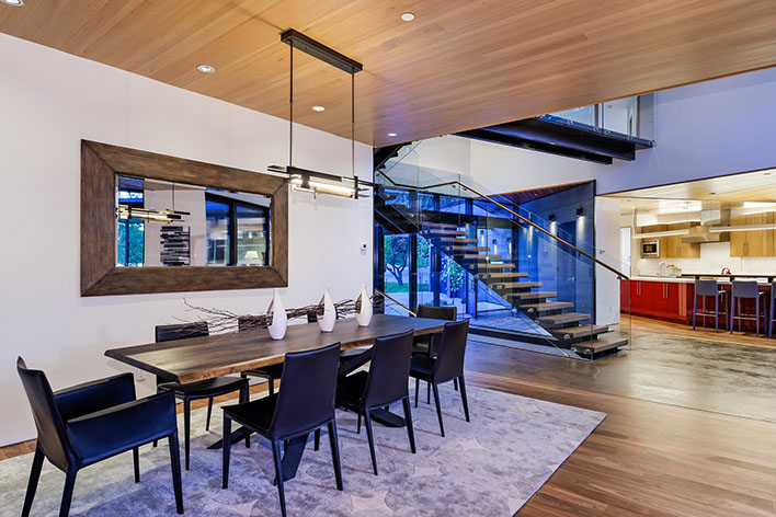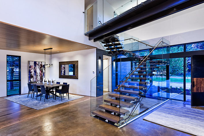 The central volume created between these wings forms the entry volume - the double height central volume of the house containing a steel stair structure connecting both above grade spaces with the basement, which contains two additional bedroom suites, large kid’s bedroom. wine room, exercise room and media room.