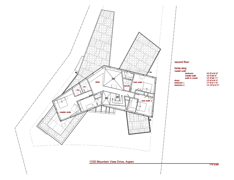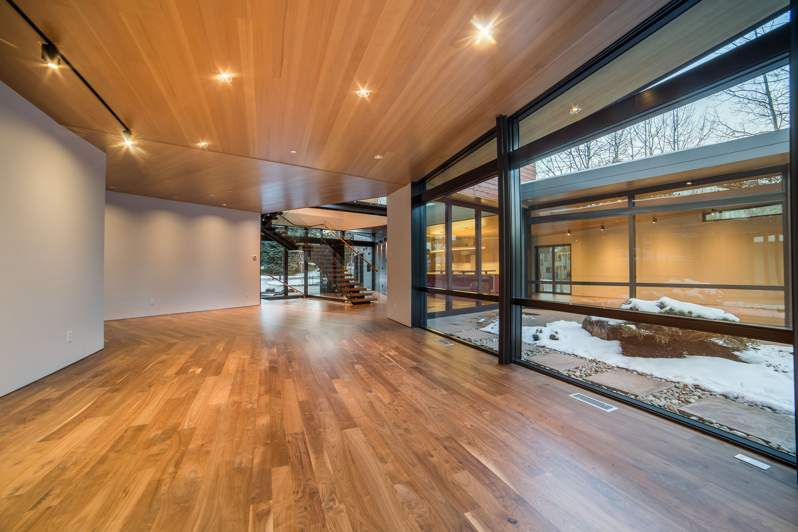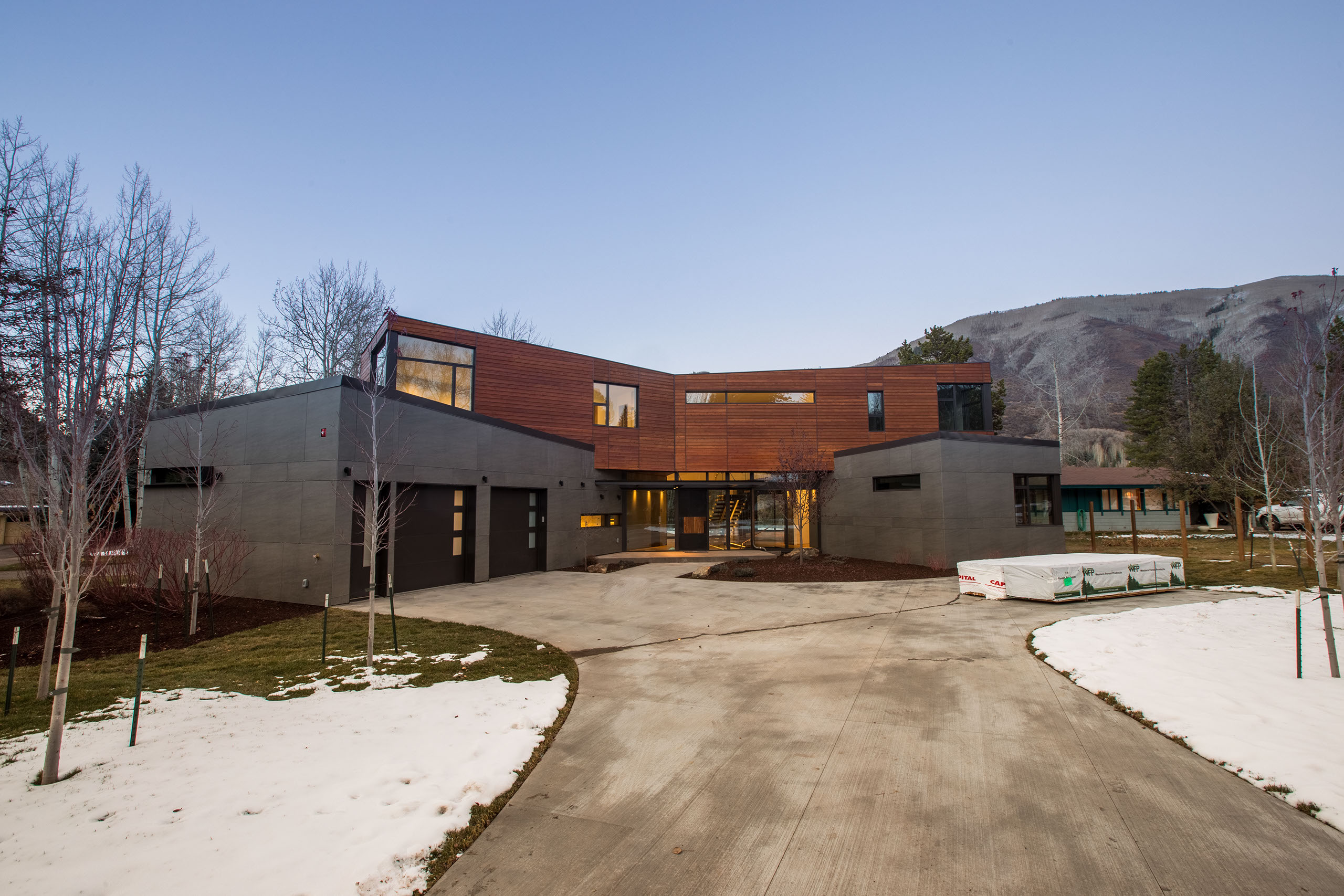 The unusual roof lines of the house are designed to maximize views by raising the roof / ceiling lines toward Aspen Mountain, Aspen Highlands, and Red Mountain.