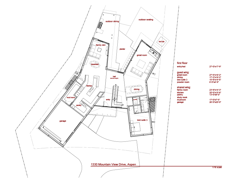 The east wing is programmatically dedicated to guest functions; great room, dining area, and guest bedroom suite. The east wing contains the family living functions; garage, mud room, pantry, kitchen and family living room.