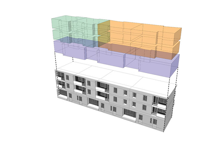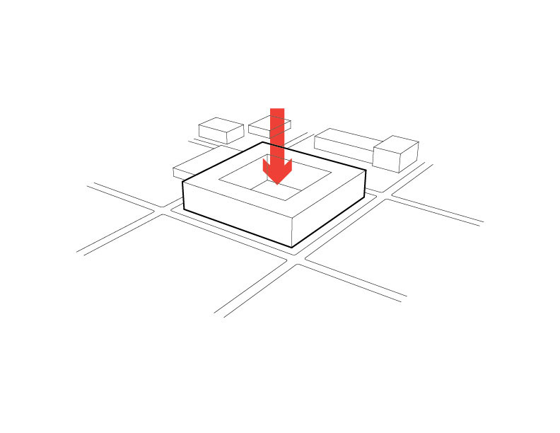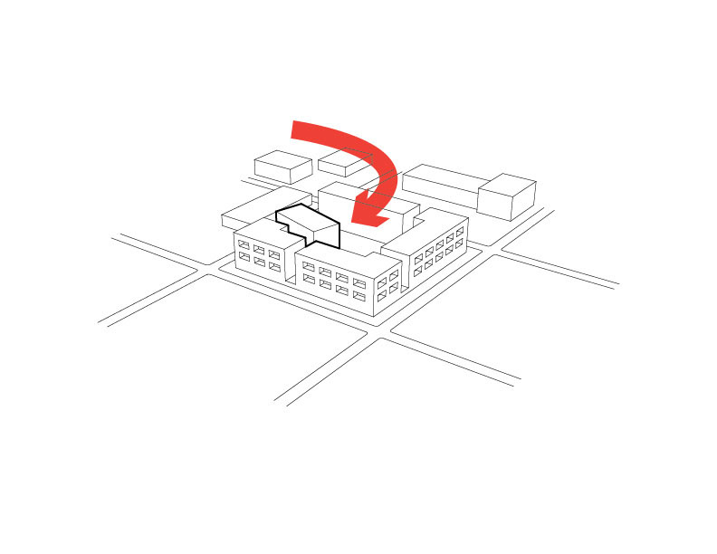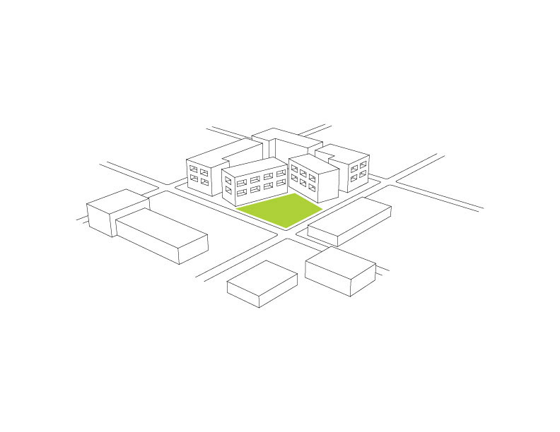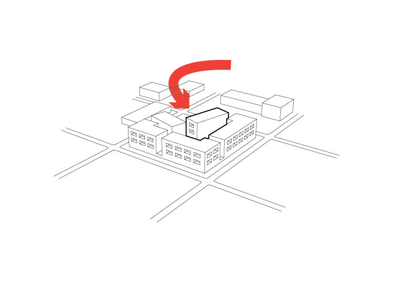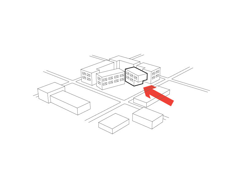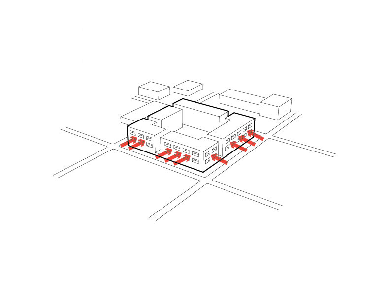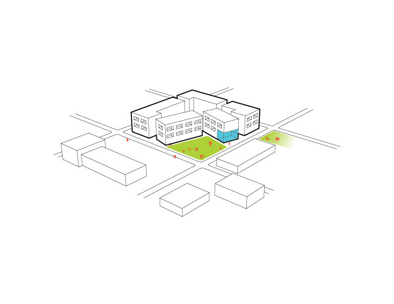 A new catalytic redevelopment project aimed at restoring housing in the downtown area of a small town growing rapidly due to gas and oil exploration. The structures cover approximately three quarters of a city block. Together with an existing building on an adjacent lot the building create and enclose a small civic space to be used for farmers markets and other events. A small splash pad is included in the civic space. Together with a new Boys and Girls Club across the street the project and civic space begin to create a “kid-centric” zone in the downtown area to spur family activities. The residential buildings are organized by new urban principles and surround two shaded courtyards. Anticipating that all three bedroom units will be occupied by families, these units are placed on the ground floor and have a small private, enclosed outdoor yard. Deep openings in the building facade provide shading of windows and doors. Roll down shades on the patios provide afternoon sun protection and color to the project.